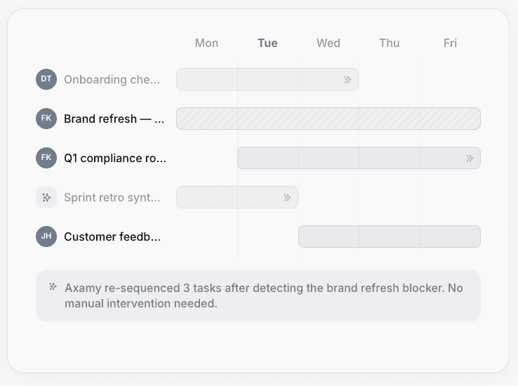 Axamy orchestrates work autonomously — assigning, sequencing, and adjusting tasks without waiting to be asked. It doesn't just track progress, it drives it.