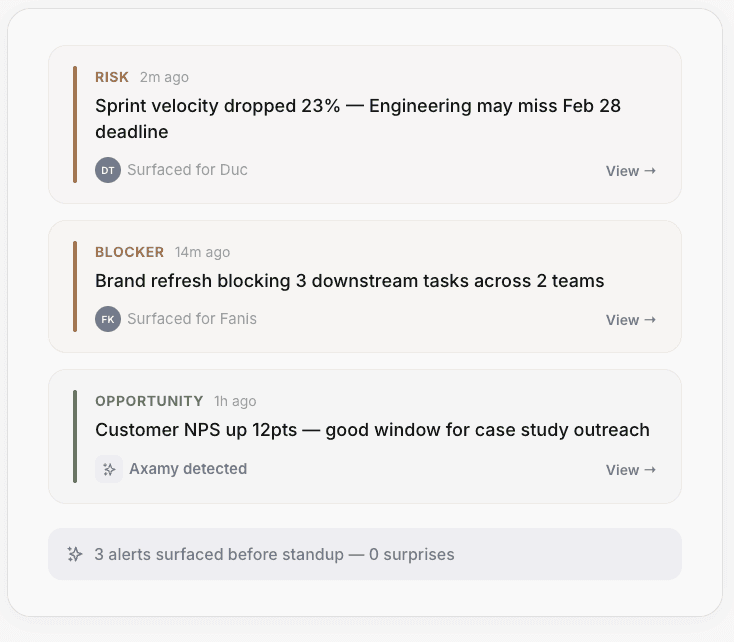 Axamy surfaces risks, blockers, and opportunities before anyone on your team sees them coming.